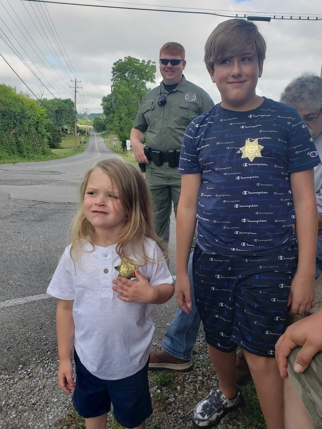 Dyer County Constable James Sansom stops for a picture with some students at Holice Powell Elementary School while on patrol October 2023.
