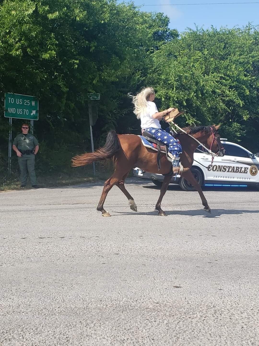 Jefferson County Constable Jacob Thompson directing four legged traffic at the Piedmont Independence Day Parade July 2022.