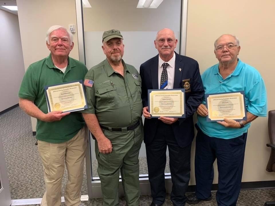 Constable Billy John Cureton, Jefferson County, presenting TCA officials with Honorary Member certificates of the Jefferson County Constables' Association. L-R Rick Gillenwater, Cureton, Bob Carroll, and Mike Ford.