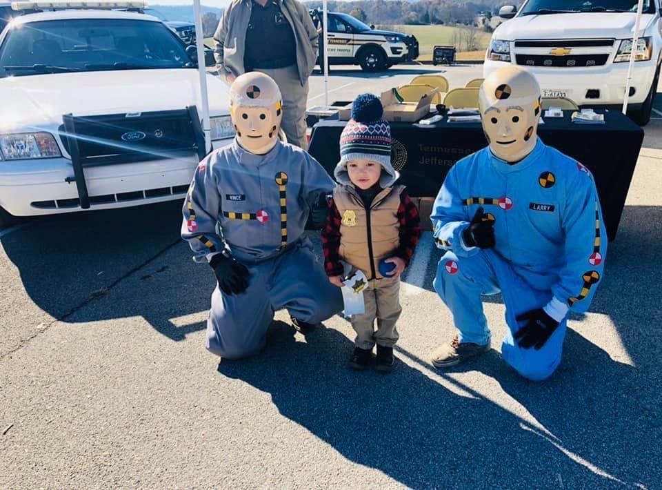 Crash test dummies Vince and Larry with a future driver at a safety fair in Jefferson County sponsored by Jefferson County Constables and the TN Highway Safety Office.